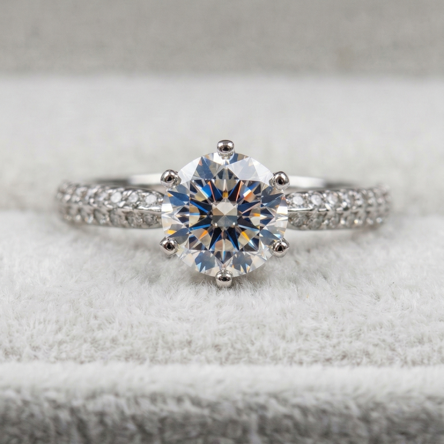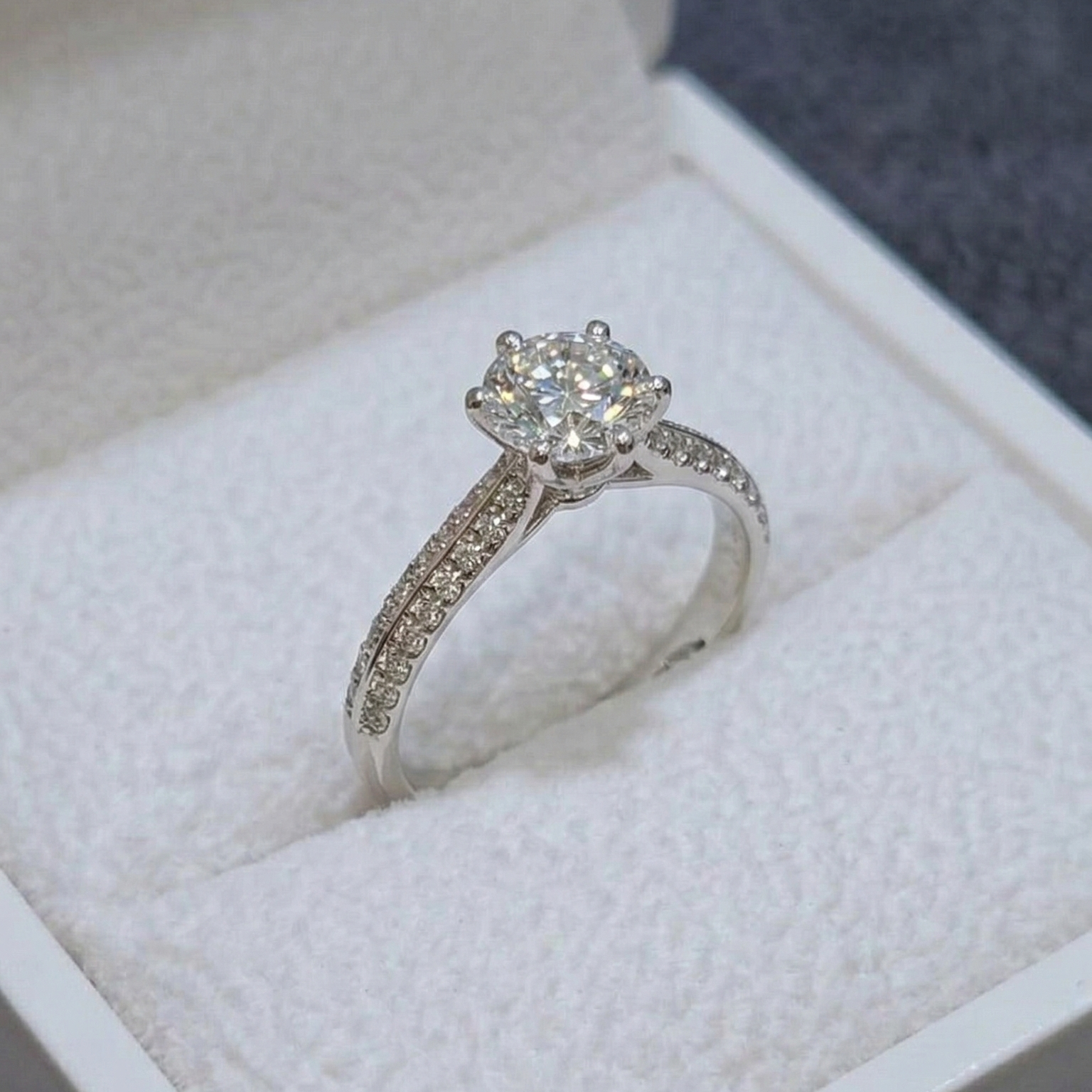 Un diseño que no pide atención, la captura. Su imponente zirconia central de corte brillante se alza sobre una banda repleta de destellos, creando un juego de luz infinito desde cualquier ángulo.